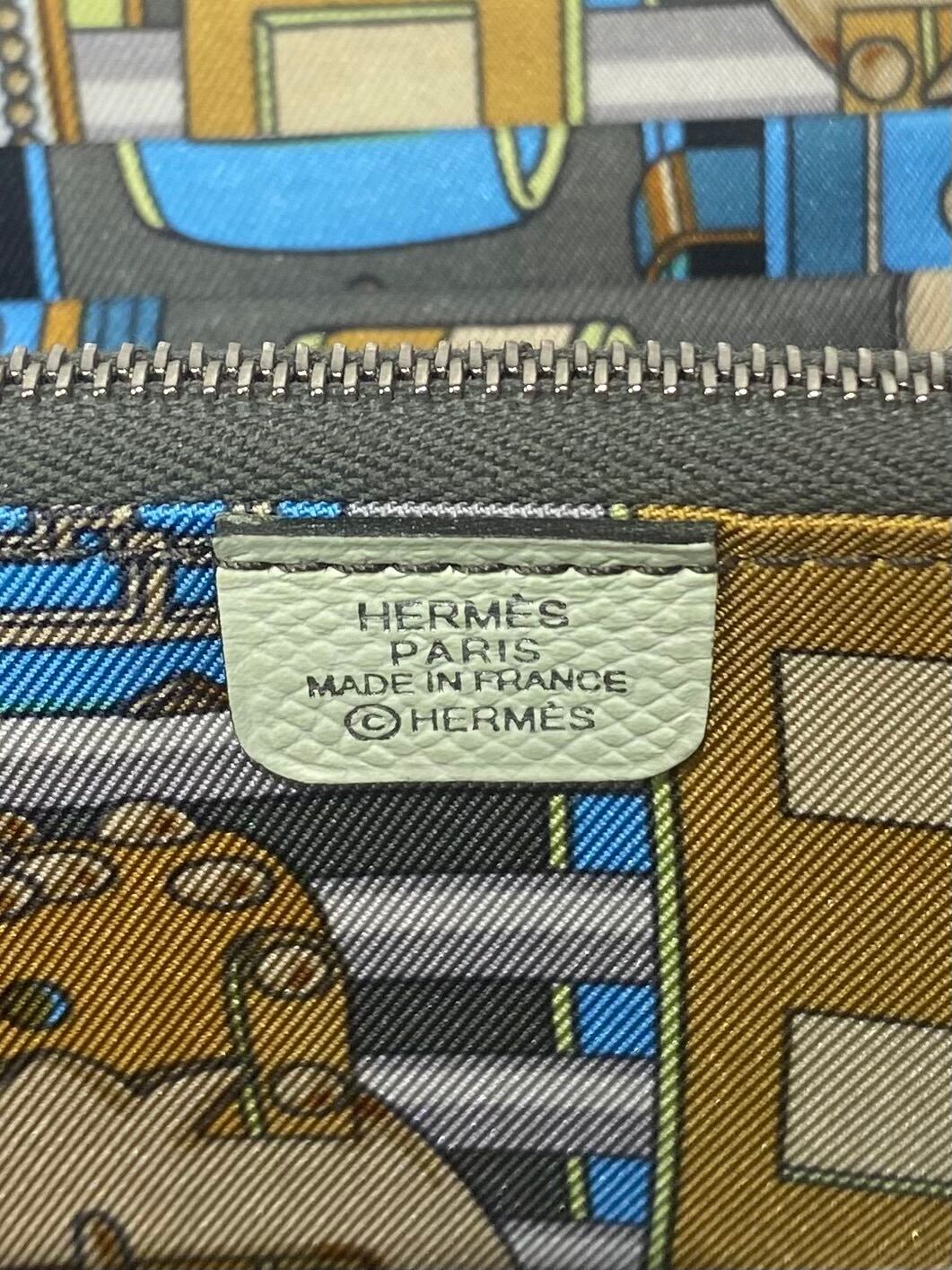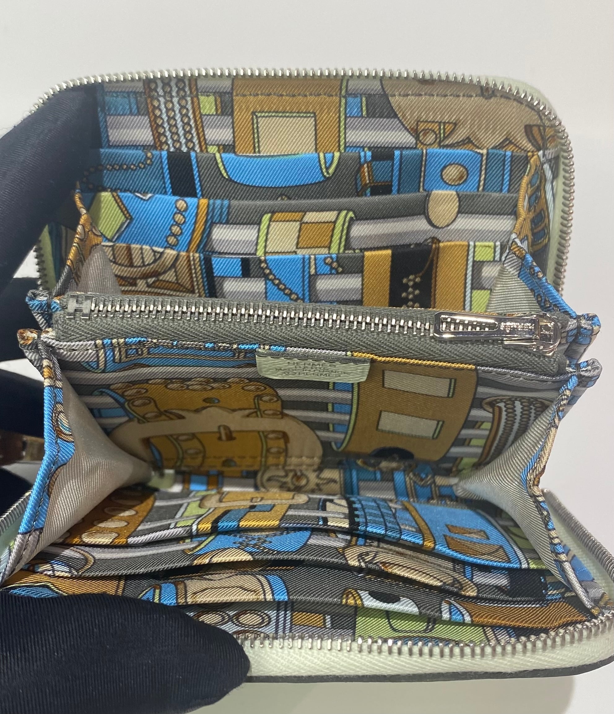 ●色:ライトグリ-ン/マルチ ●サイズ:約9.5×11×1.5cm ●素材:レザー/シルク ●内側:メインポケット×2、カードポケット×6、ジップ式小銭入れ×1、 ●生産国:フランス ●付属品:ブランド箱