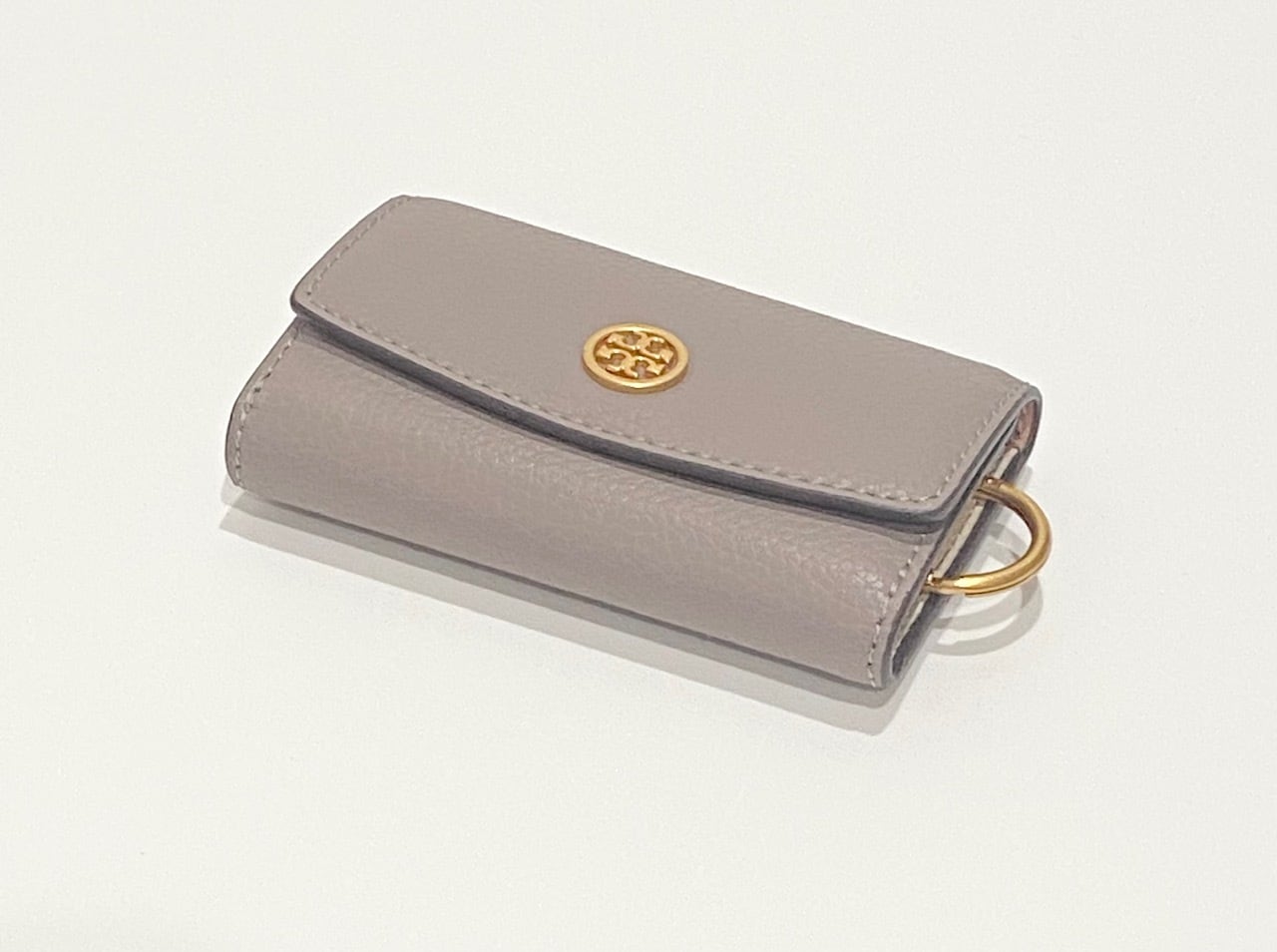 素材:ぺブルドレザー 色 :グレージュ 金具色:ゴールド サイズ:約6.5×10.5×1㎝ 開閉:ホック式 内側:キーフック×4、キーリング、ポケット×1 外部:- 付属品:-