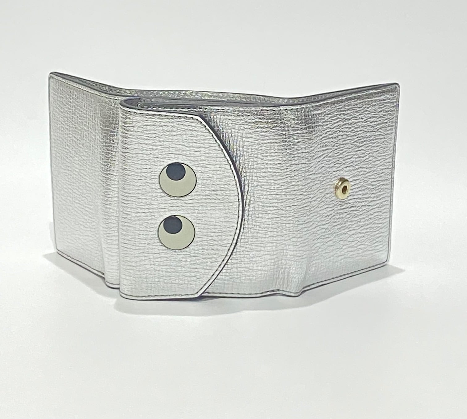 素材:山羊革 色 :シルバー サイズ:約H7.5×W9.5×D3cm 開閉:スナップ式 内側:オープンポケット×2、札入れ×1、カードポケット×5 外側:スナップ式小銭入れ×1 付属品:ブランド箱