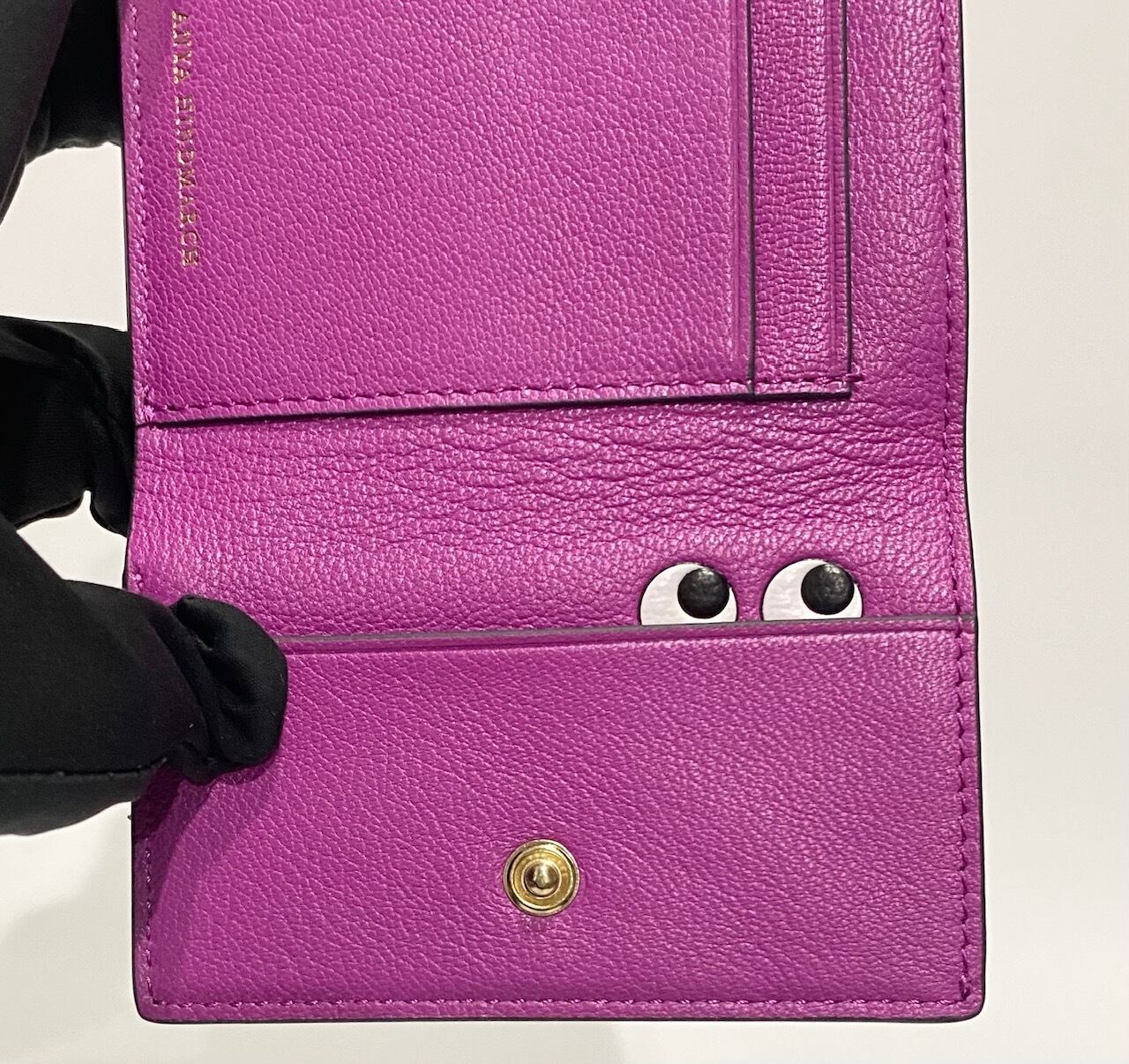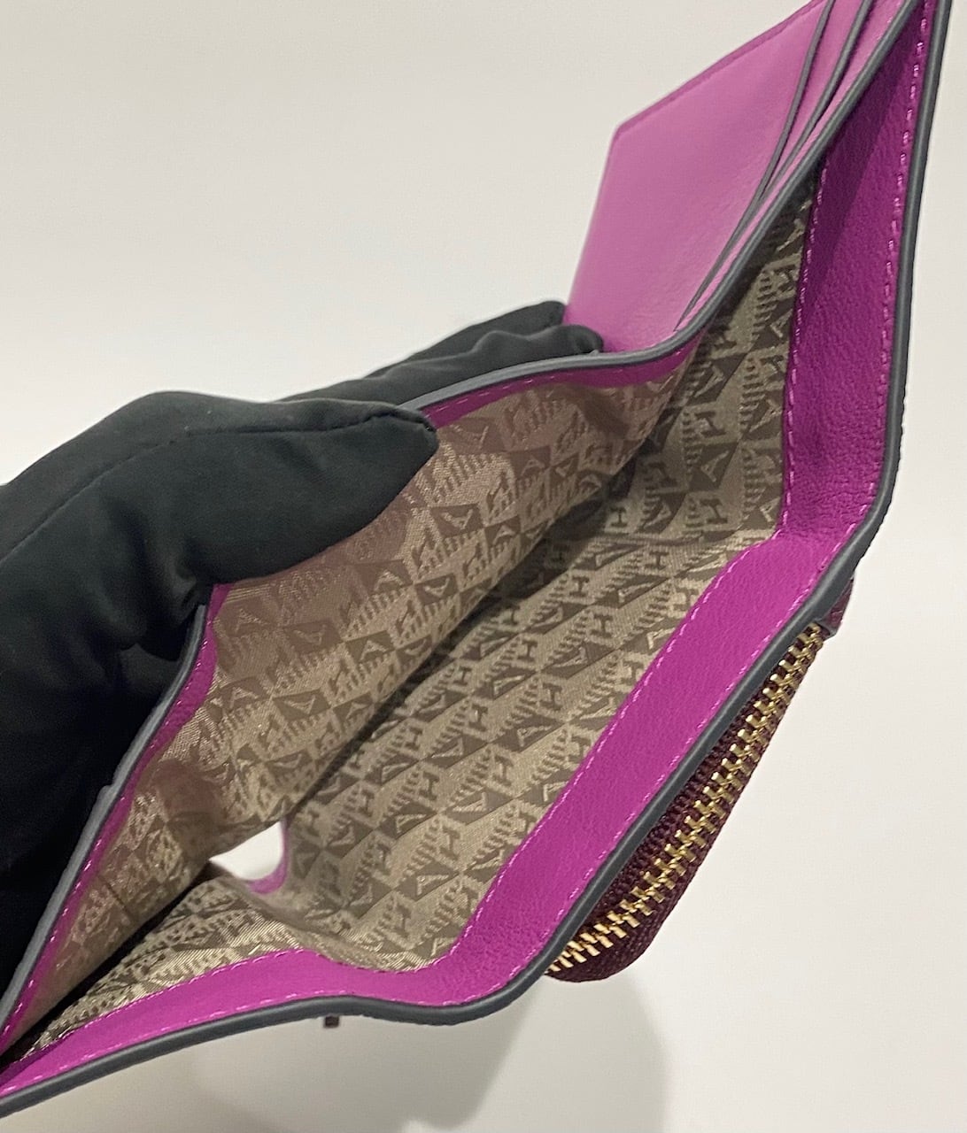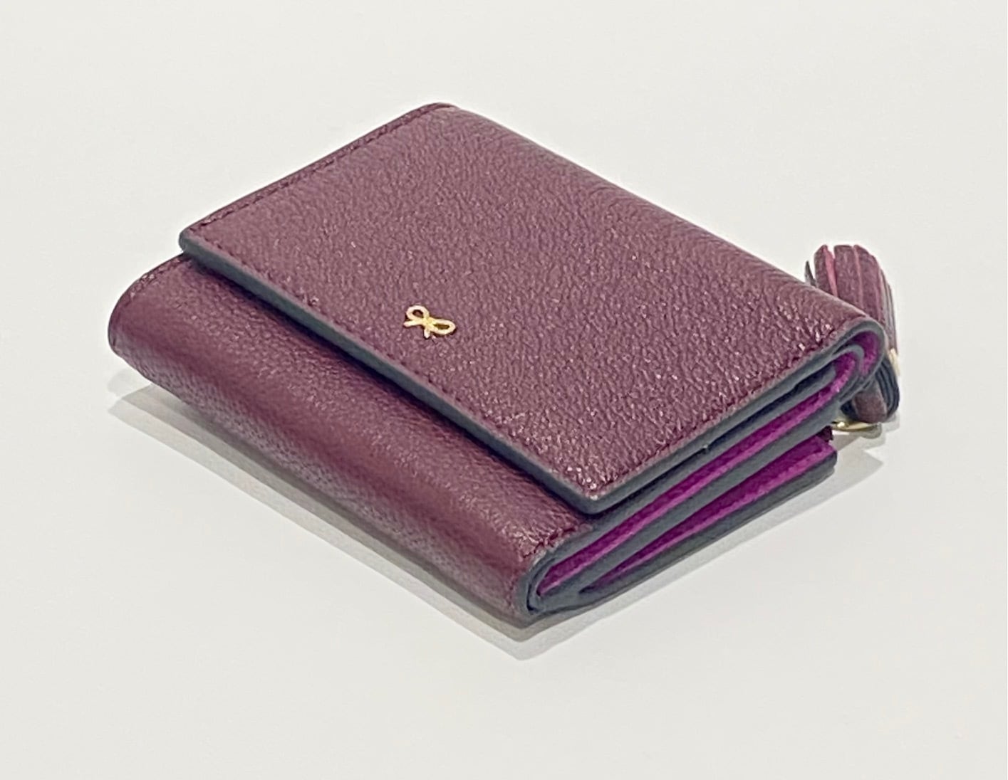 素材:山羊革 色 :ボルドー×ピンクパープル サイズ:約H7.5×W9×D1.5㎝ 内側:札入れ×1、カード入れ×4、オープンポケット×1 外側:ファスナー式小銭入れ×1 開閉:ホック式 付属品:ブランド箱
