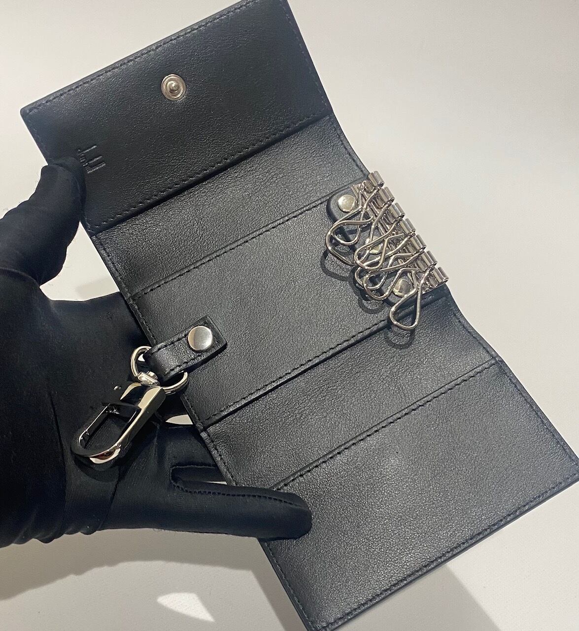 素材:レザー 色 :ブラック/金具:シルバー 仕様:スナップ式開閉 内側:キーフック×6 ポケット×2 キーリング×1 外側:- サイズ:約H10×W6.5×D2.5㎝ 付属品:ブランド箱
