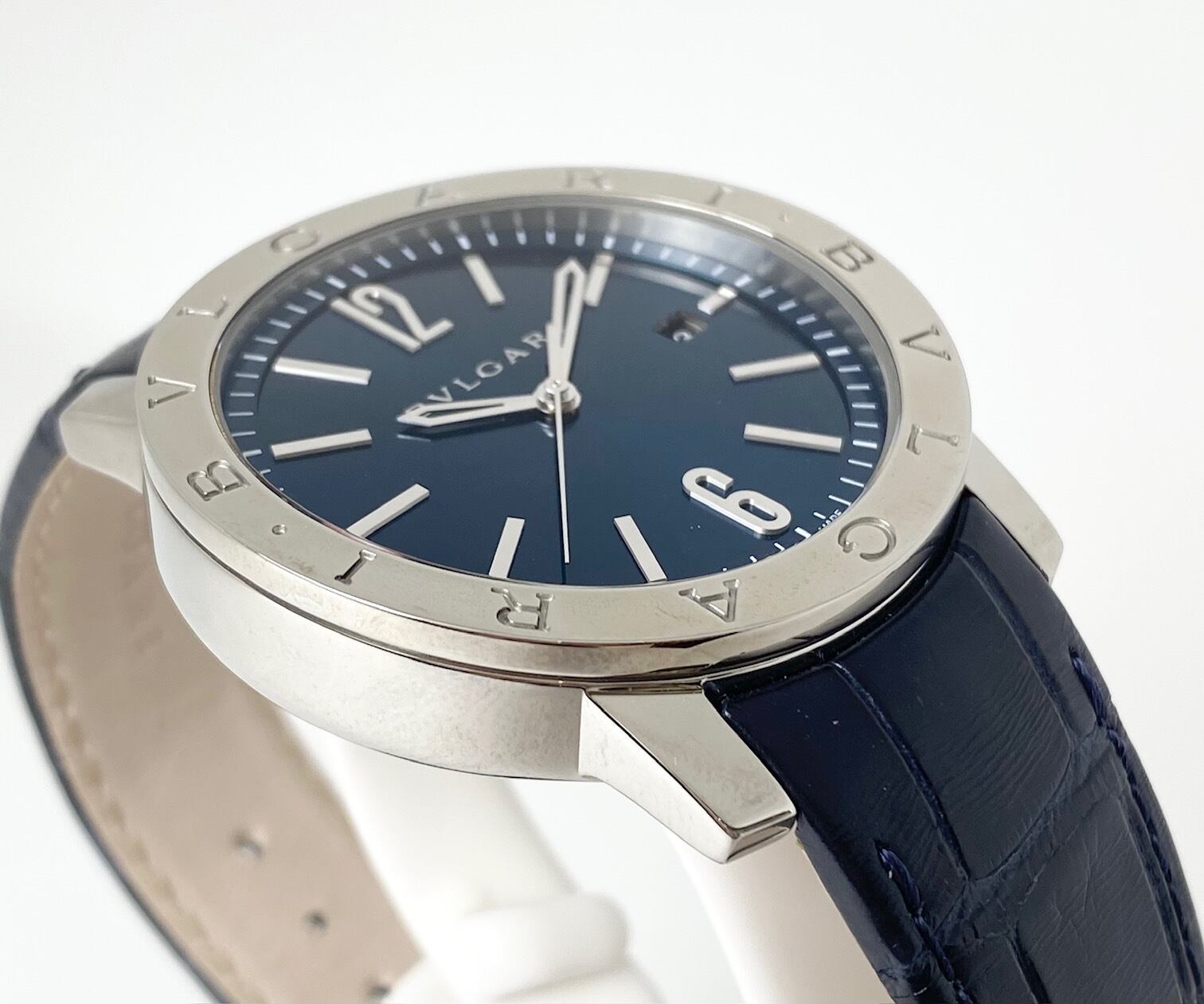 ●文字盤色:ブルー ●素材:(ケース)SS/(バンド)アリゲーター革/(風防)サファイアガラス ●ムーブメント:自動巻 ●防水性能:日常生活防水 ●サイズ:(ケース)約34×34×10mm/(重量)約92.5g/(腕回り)約14〜18cm ●製造国:スイス ●保証期間:2年間