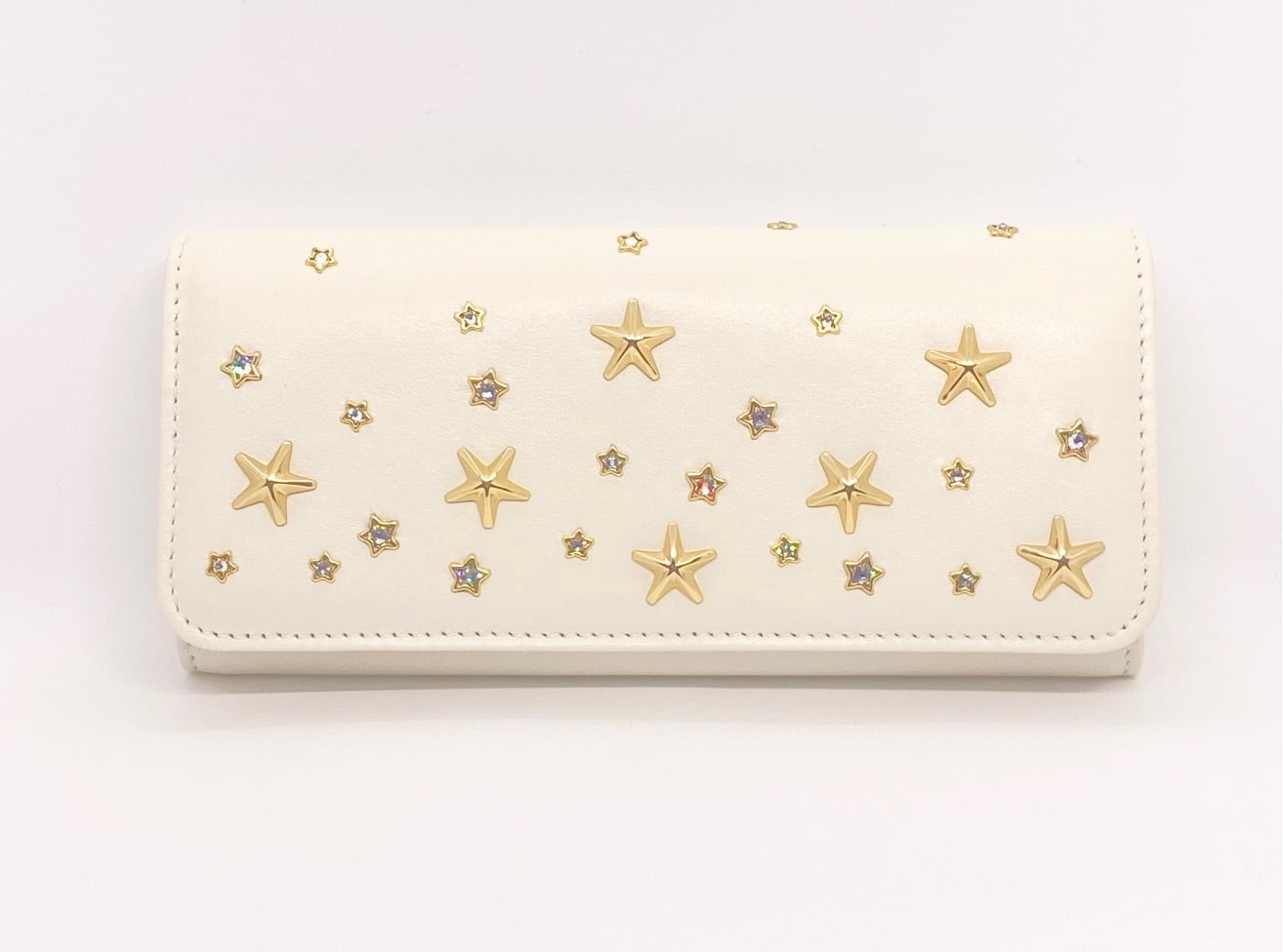 ●素材:レザー ●カラー:ホワイト系 ●サイズ:約H10×W19×D3cm ●開閉種別:スナップ式 ●内部様式:ファスナー式小銭入れ×1、札入れ×2、オープンポケット×4、カードポケット×10 ●生産国:ITALY ●付属品:専用ボックス